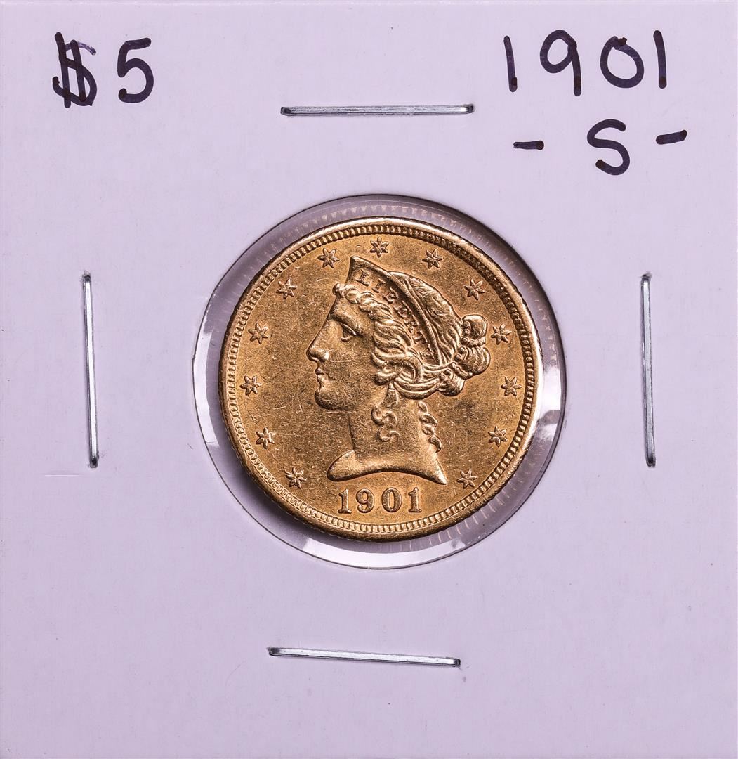 One 1901-S $5 Liberty Head Half Eagle Gold Coin.