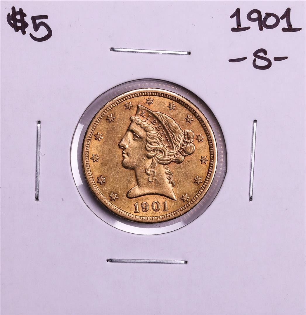 One 1901-S $5 Liberty Head Half Eagle Gold Coin.