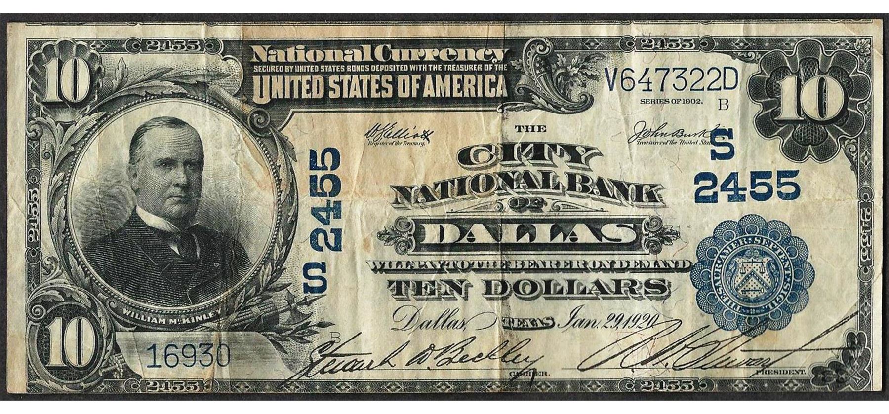 One 1902 $10 City NB of Dallas, TX CH# 2455 National Currency Note.