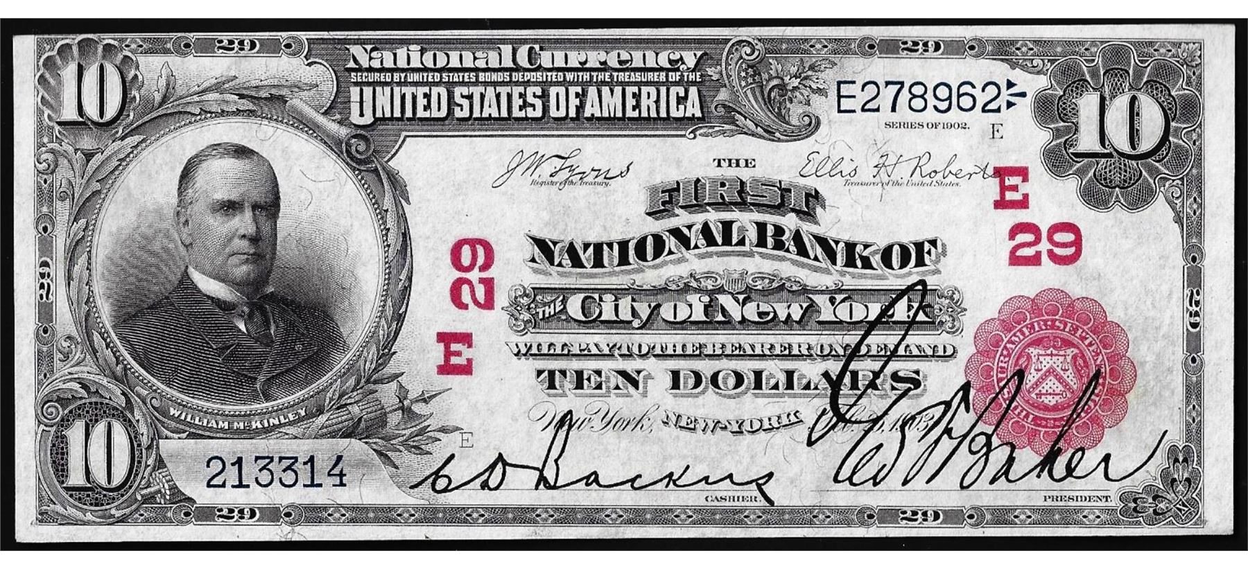 One 1902 $10 First National Bank of New York, NY CH# 29 National Currency Note Red Seal.