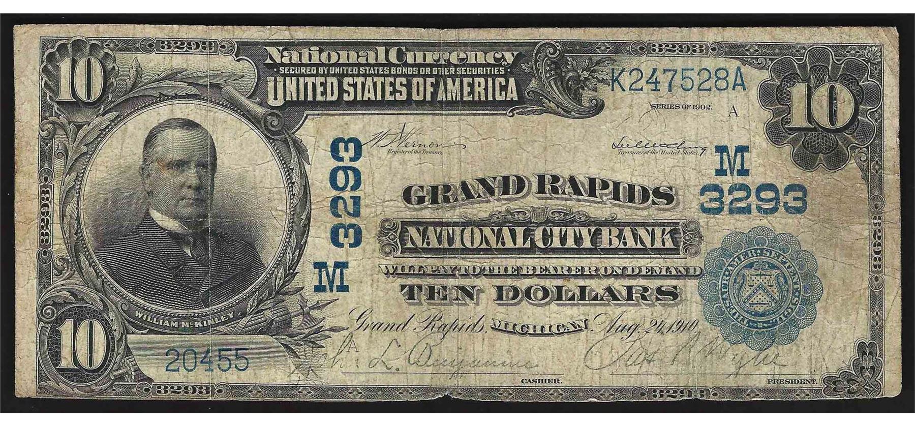 One 1902 $10 Grand Rapids Michigan National City Bank Note.
