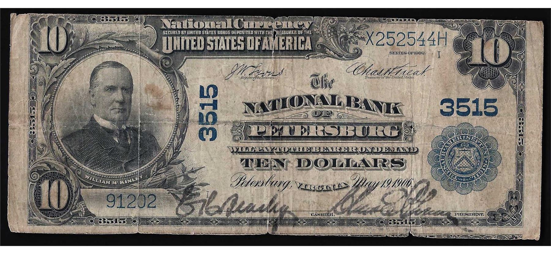 One 1902 $10 The National Bank of Petersburg Currency Note.