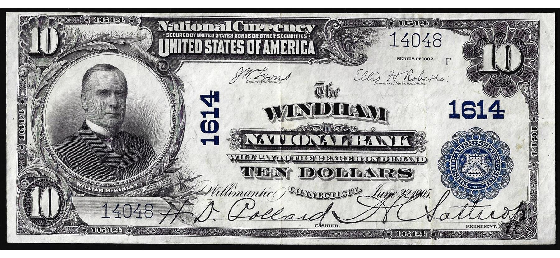 One 1902 $10 The Windham National Bank of Willimantic, CT CH# 1614 National Currency Note.