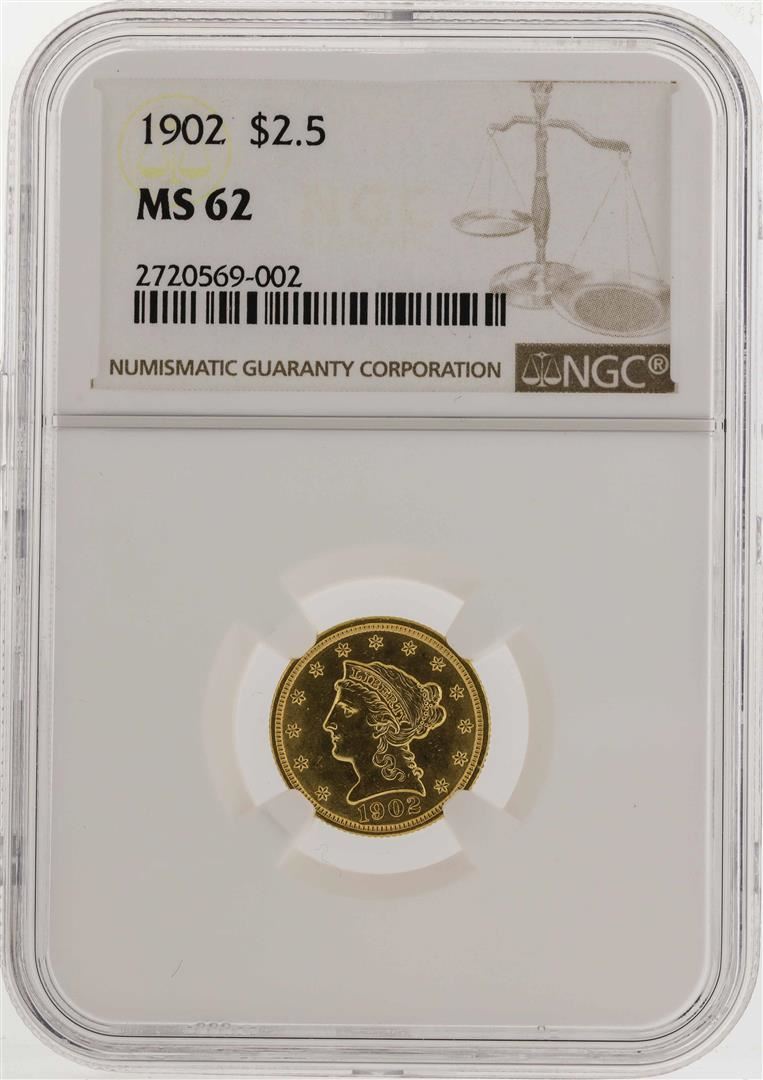 One 1902 $2 1/2 Liberty Head Quarter Eagle Gold Coin NGC MS62. NGC Certified.