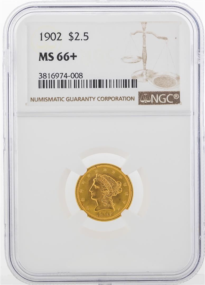 One 1902 $2 1/2 Liberty Head Quarter Eagle Gold Coin NGC MS66+. NGC Certified.