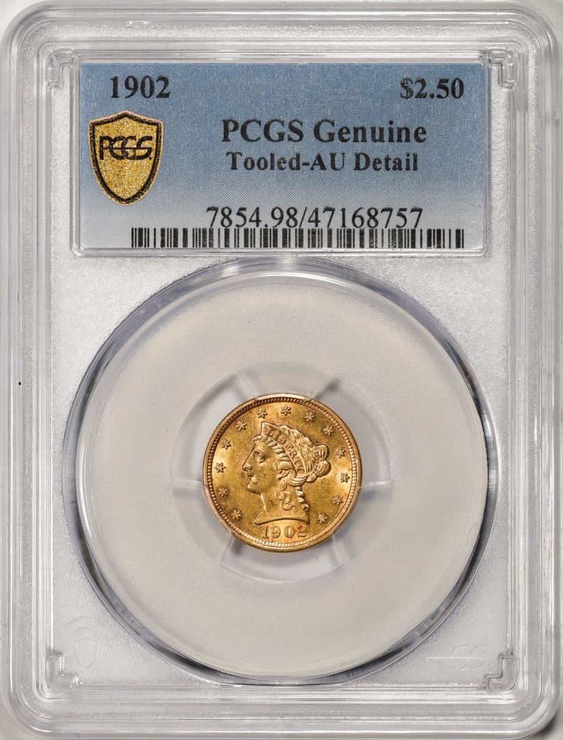 One 1902 $2 1/2 Liberty Head Quarter Eagle Gold Coin PCGS Genuine Tooled AU Detail. PCGS Graded.