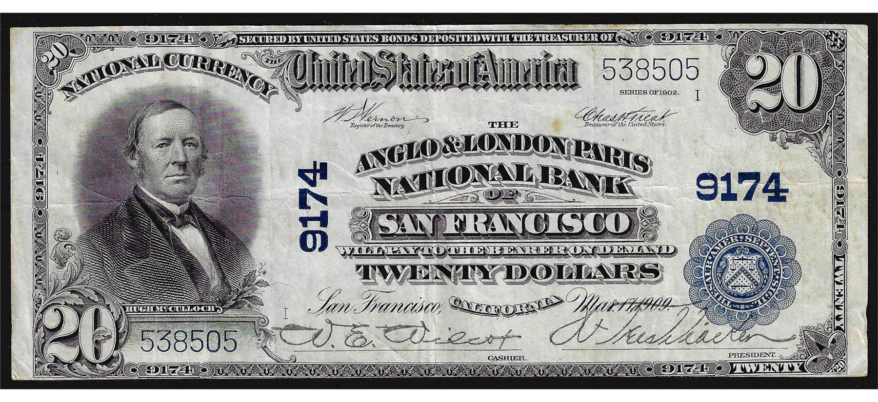 One 1902 $20 Anglo & London Paris National Bank Note.