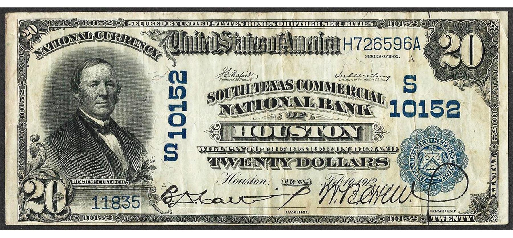 One 1902 $20 South Texas Commercial NB of Houston, TX CH# 10152 National Currency Note.