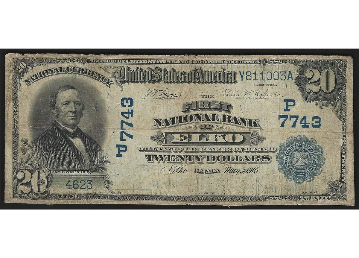 One 1902 $20 The First National Bank of Elko Nevada National Currency Note.