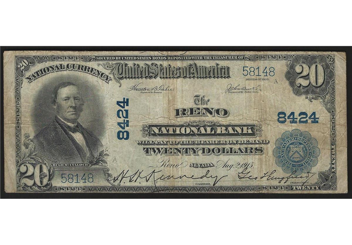 One 1902 $20 The Reno National Bank Nevada National Currency Note.