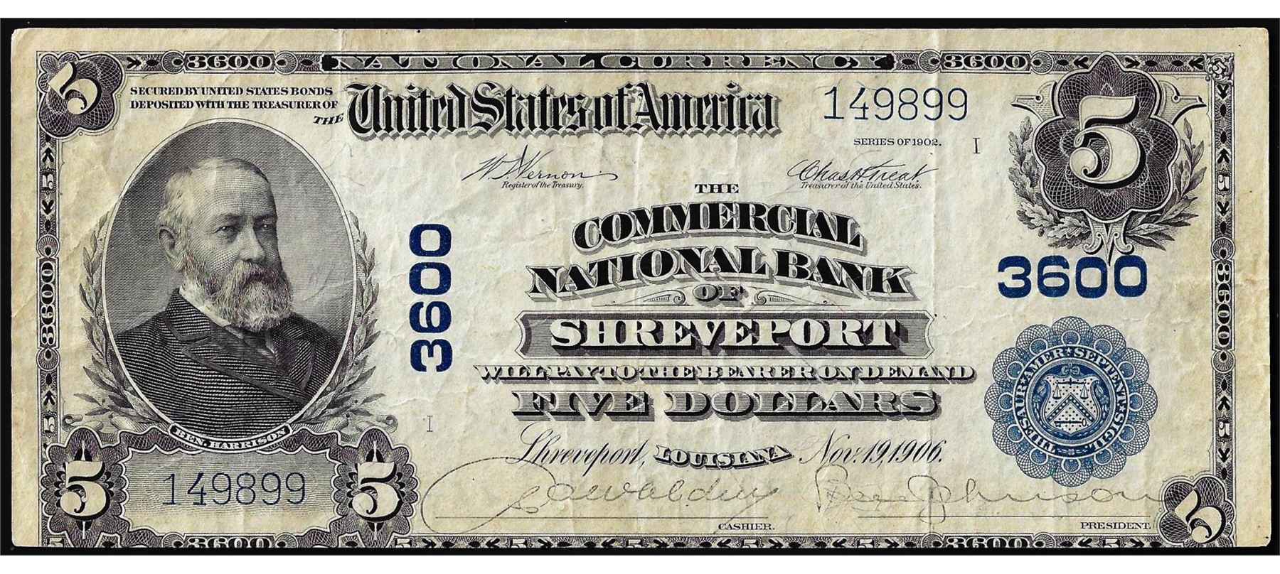 One 1902 $5 Commercial NB of Shreveport, Louisiana CH# 3600 National Currency Note.