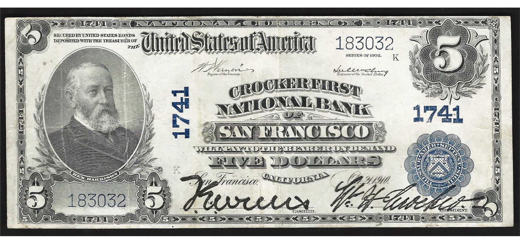 One 1902 $5 Crocker First National Bank San Francisco California Currency Note.