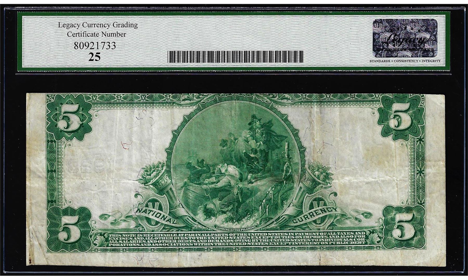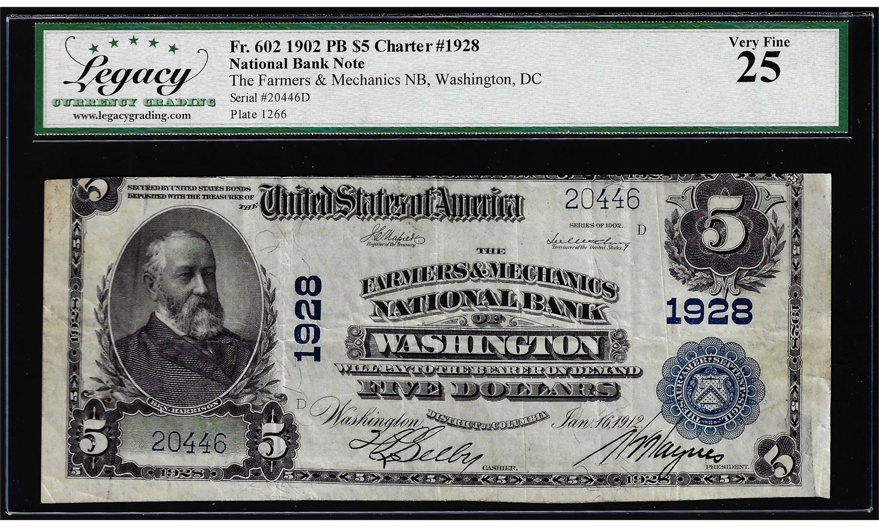 One 1902 $5 Farmers & Mechanics NB of Washington, DC CH# 1928 National Currency Note VF25. Legacy Graded.