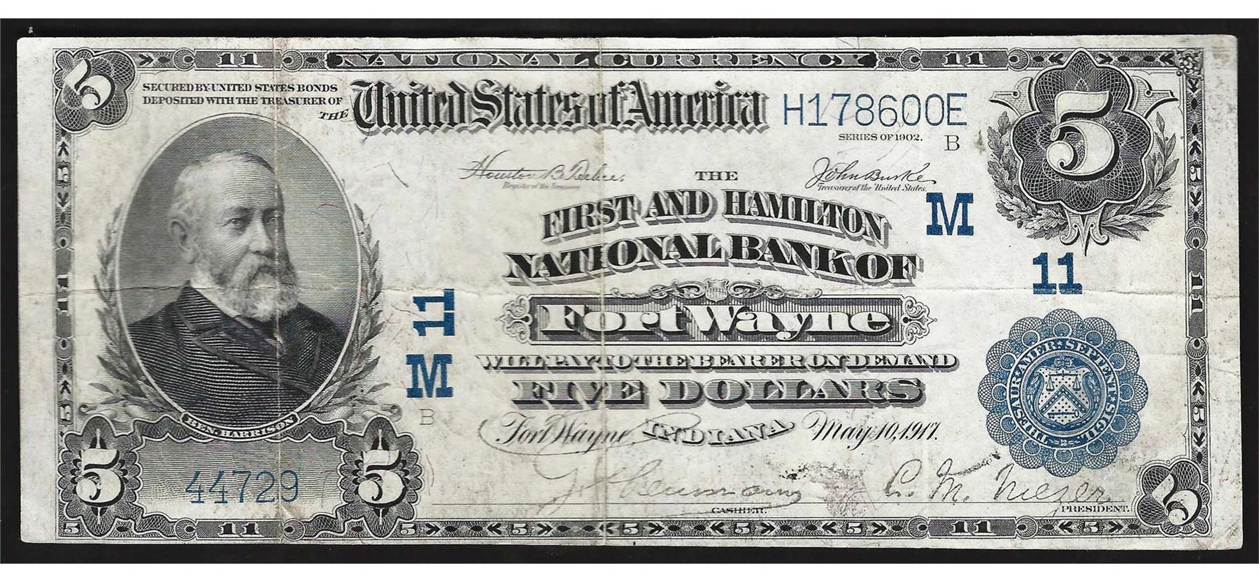 One 1902 $5 Fort Wayne Indiana National Currency Note CH# 11.