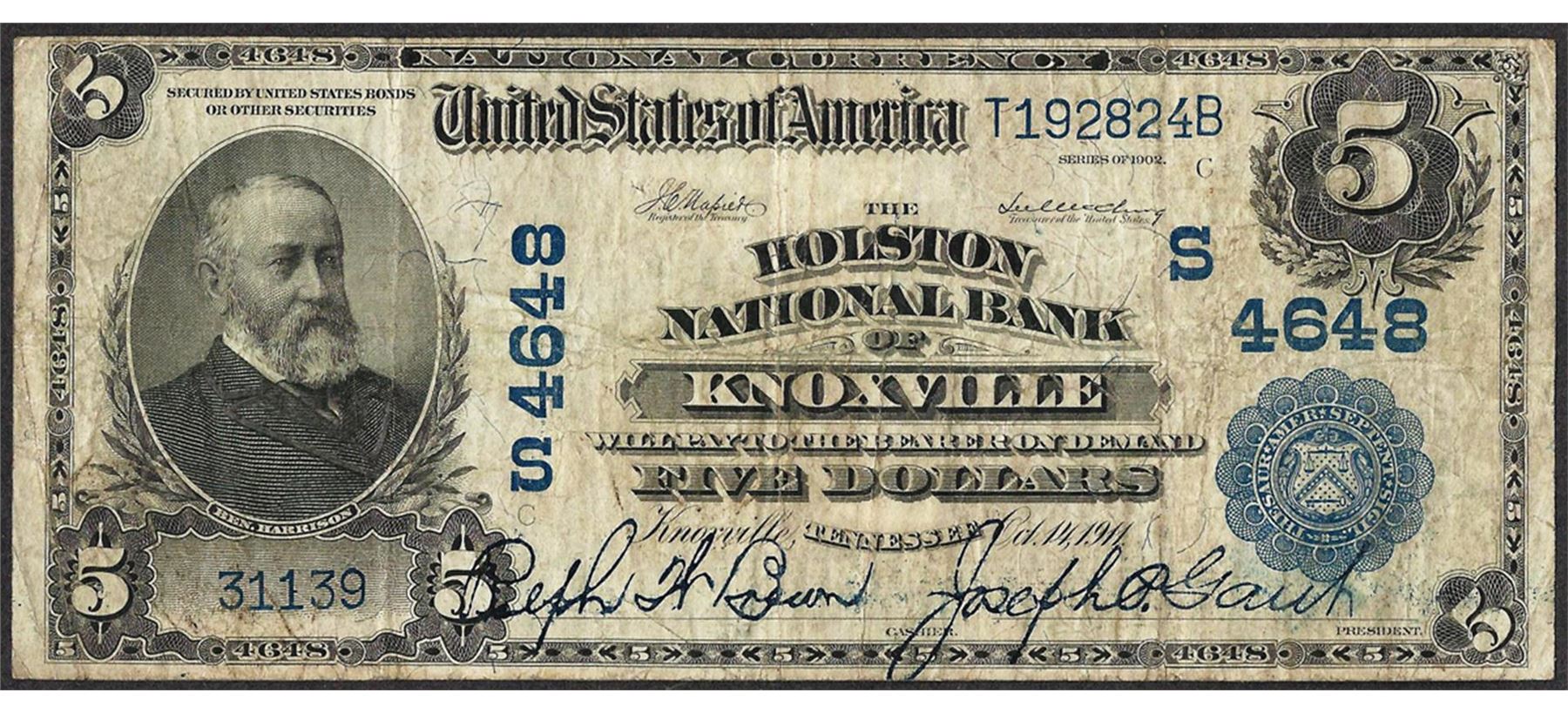 One 1902 $5 Holston NB of Knoxville, TN CH# 4648 National Currency Note.