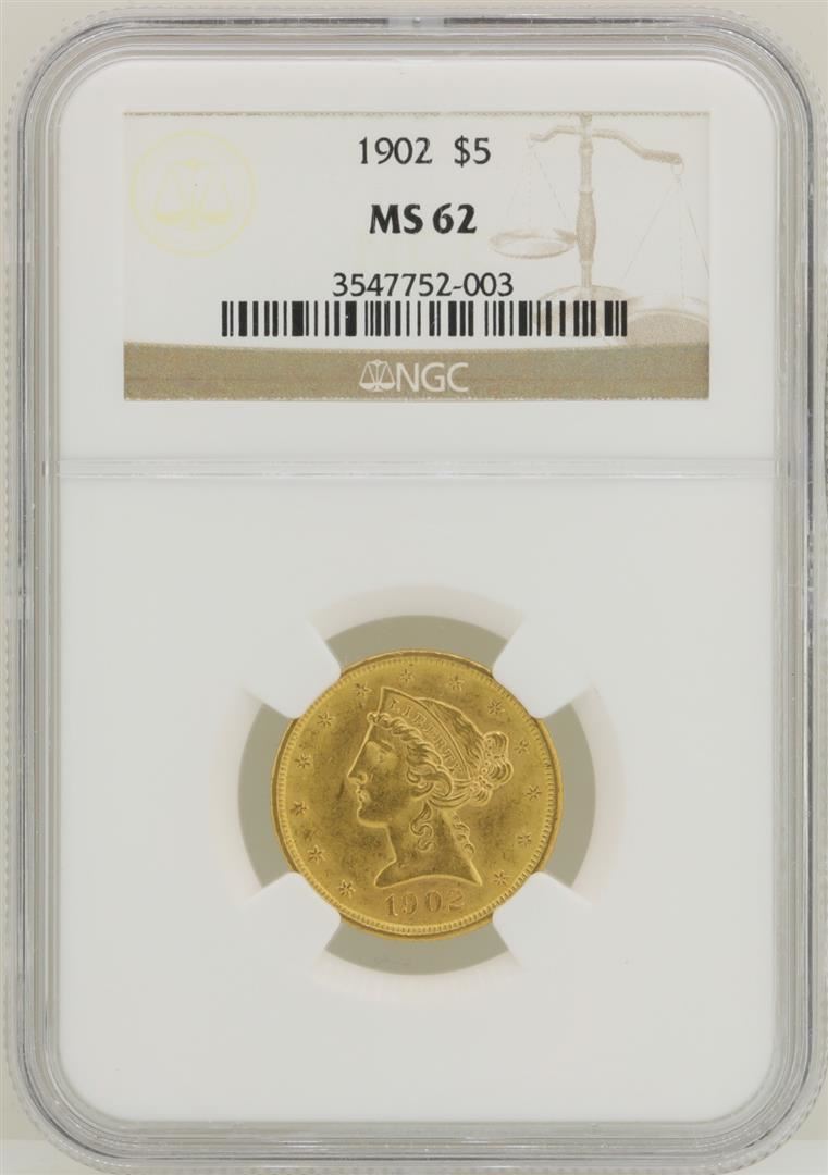 One 1902 $5 Liberty Head Half Eagle Gold Coin NGC MS62. NGC Certified.