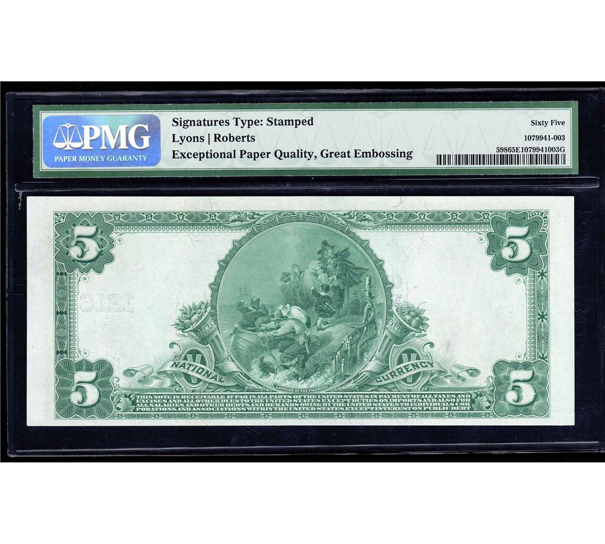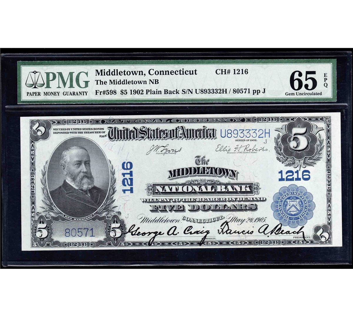 One 1902 $5 Middletown National Bank Note PMG Gem Uncirculated 65EPQ. PMG Certified.