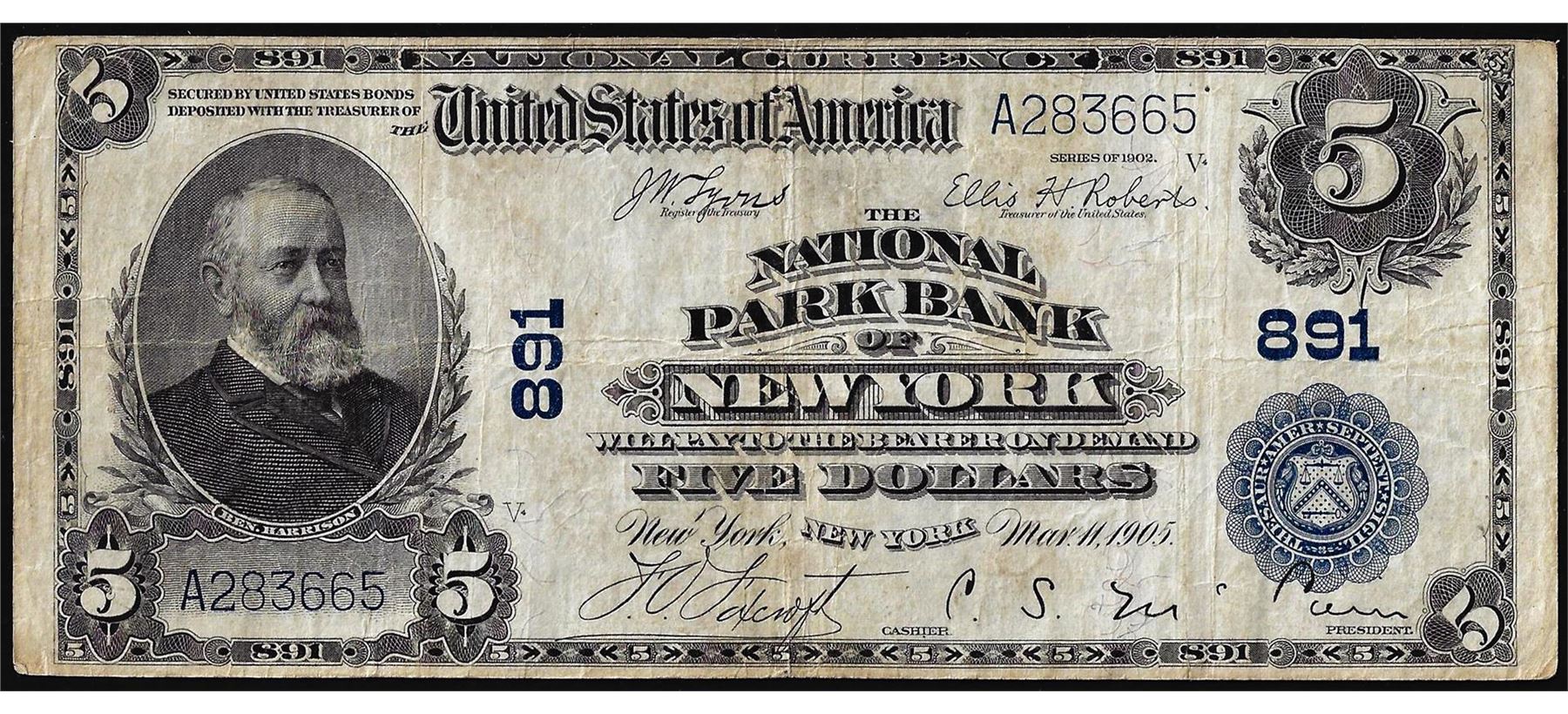 One 1902 $5 National Park Bank of New York, NY CH# 891 National Currency Note.