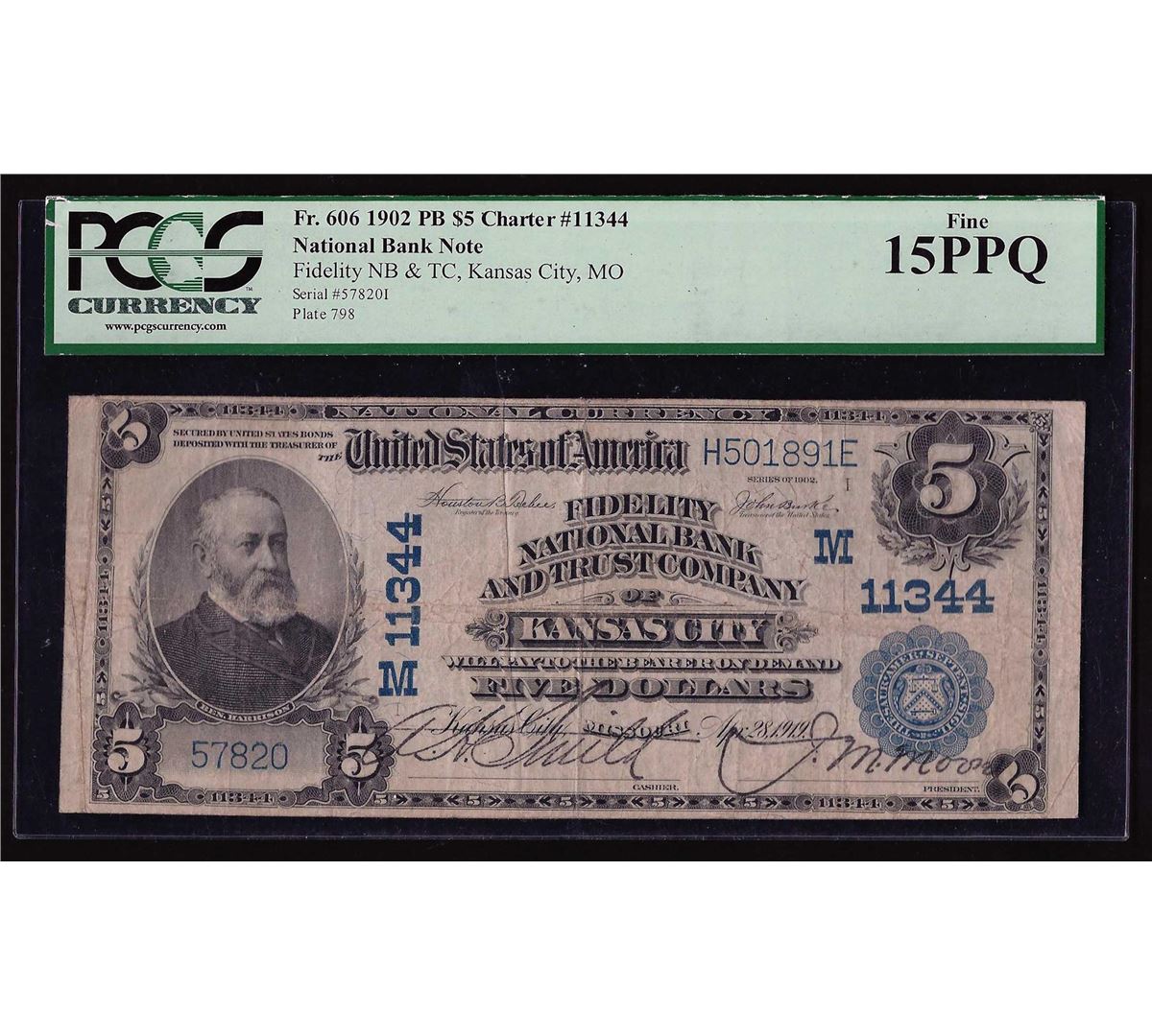 One 1902 $5 Plain Back National Bank & Trust of Kansas City Note PCGS F 15PPQ.