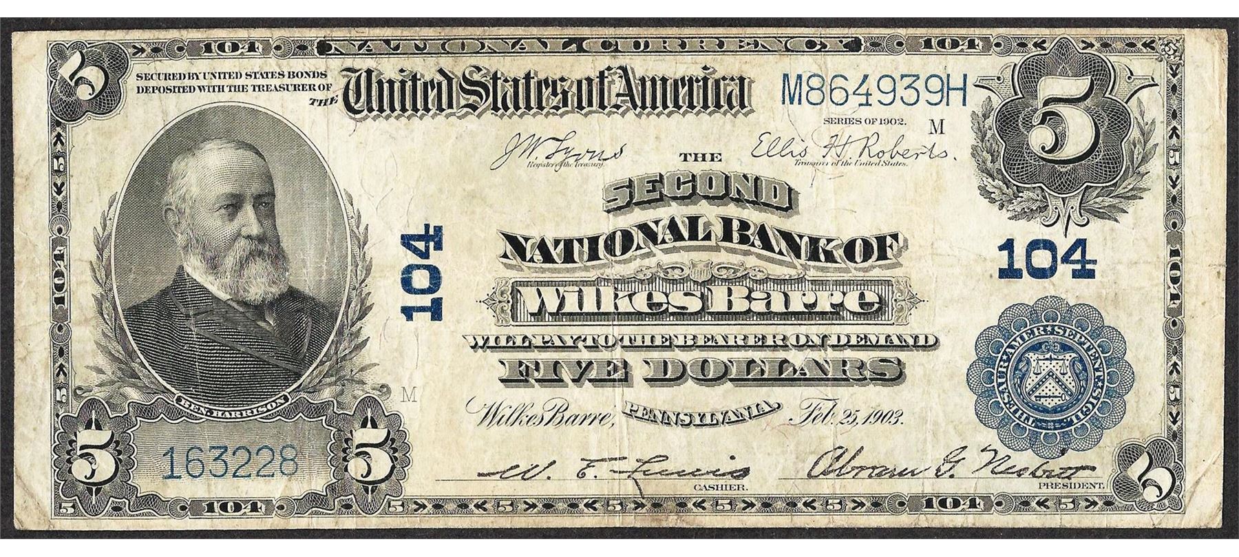One 1902 $5 Second NB of Wilkes-Barre, PA CH# 104 National Currency Note.