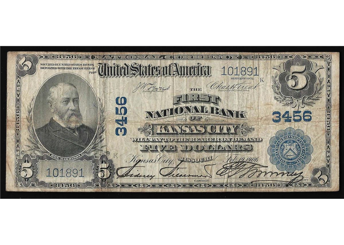 One 1902 $5 The First National Bank of Kansas City National Currency Note.
