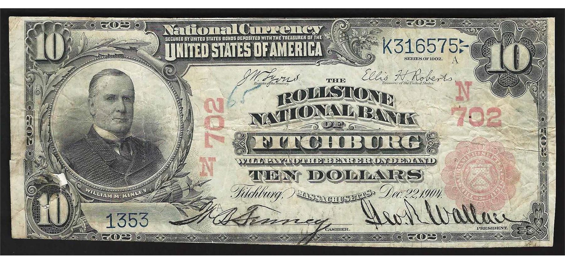 One 1902 $5 The Rollstone National Bank Fitchburg, MA CH# (N)702 National Currency Note.
