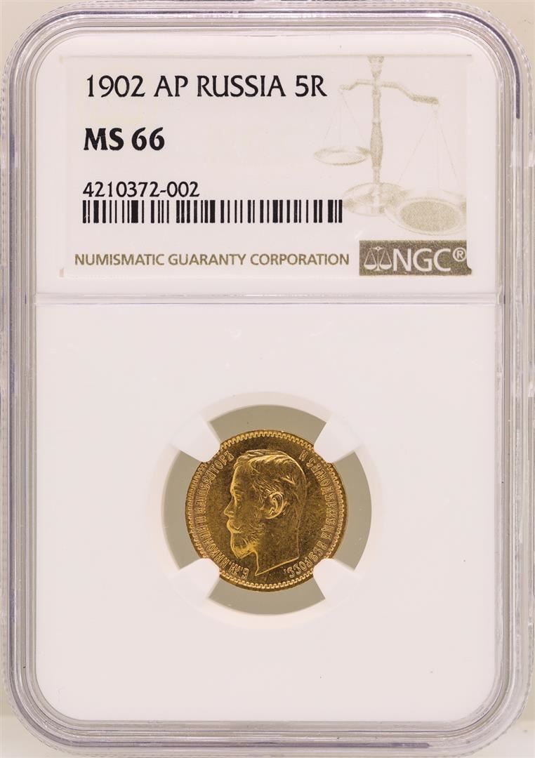 One 1902-AP Russia 5 Roubles Gold Coin NGC MS66. NGC Certified.