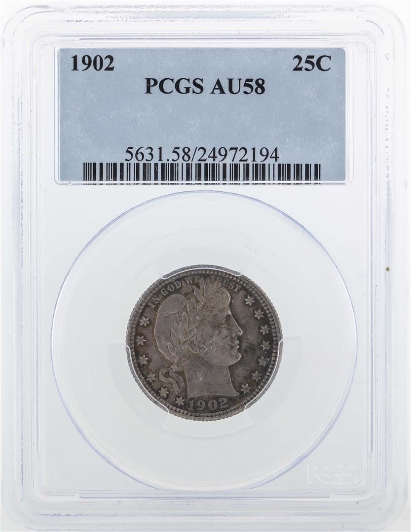One1902 Barber Quarter Dollar Coin PCGS AU58. PCGS Graded.