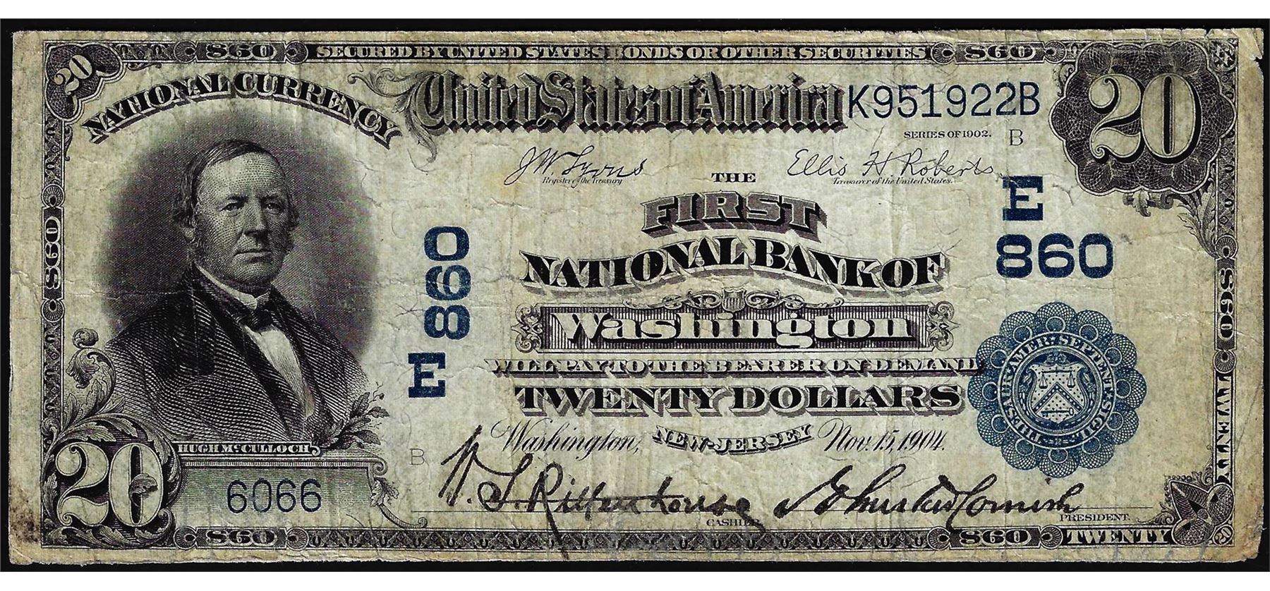 One 1902 Date Back $20 NB of Washington, New Jersey CH# 860 National Currency Note.