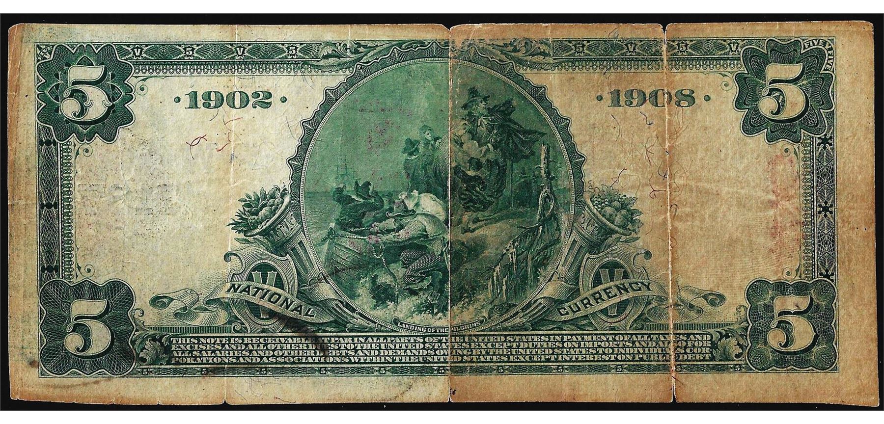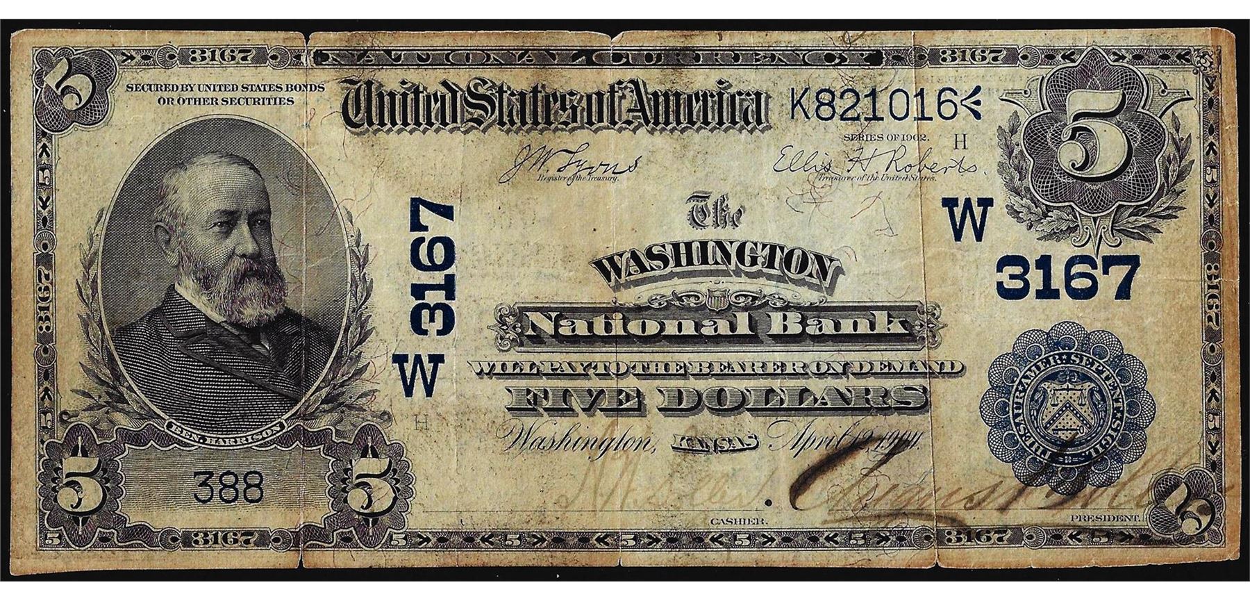 One 1902 Date Back $5 Washington NB Washington, Kansas CH# 3167 National Currency Note.