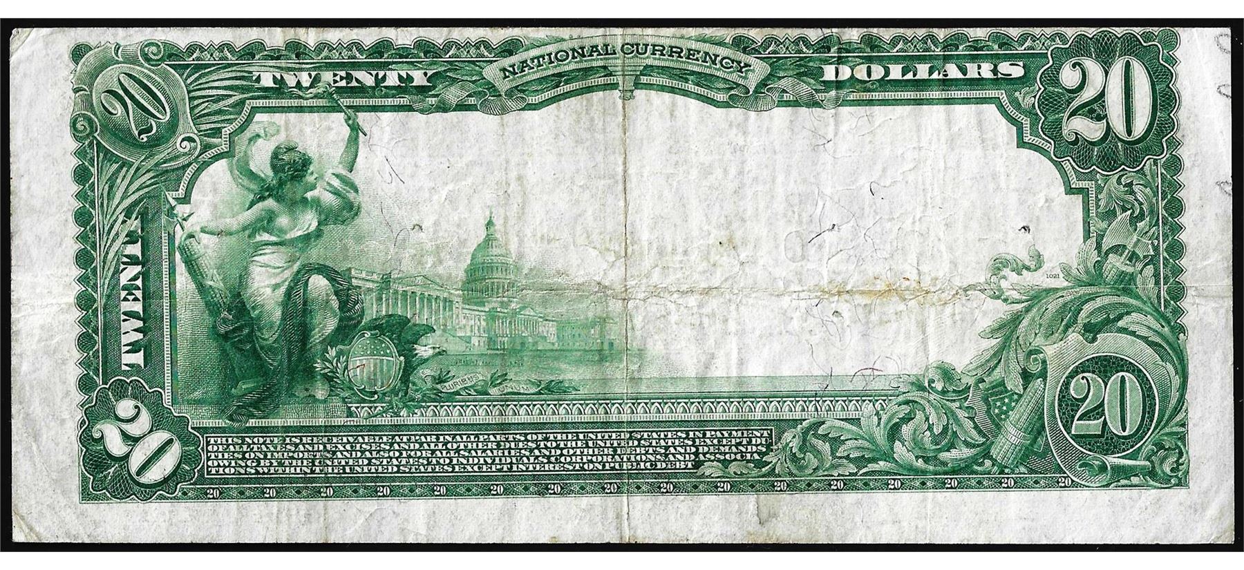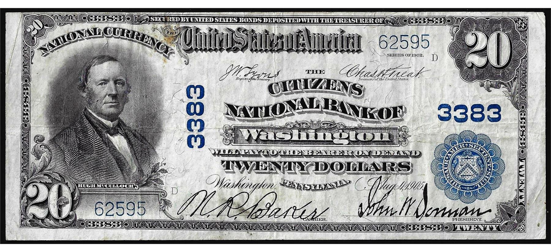 One 1902 PB $20 Citizens NB of Washington, Pennsylvania CH# 3383 National Currency Note.