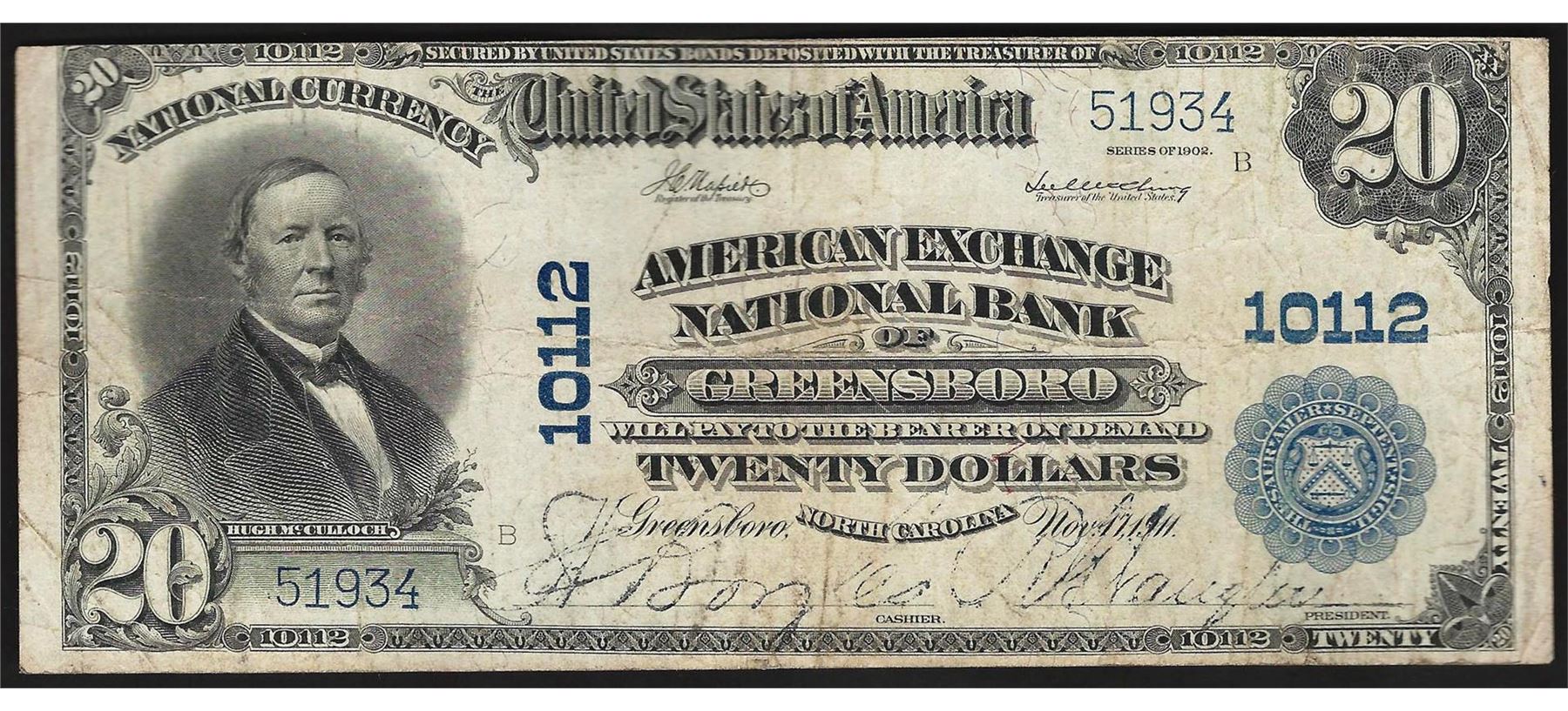 One 1902 PB $20 Greensboro North Carolina National Currency Note.