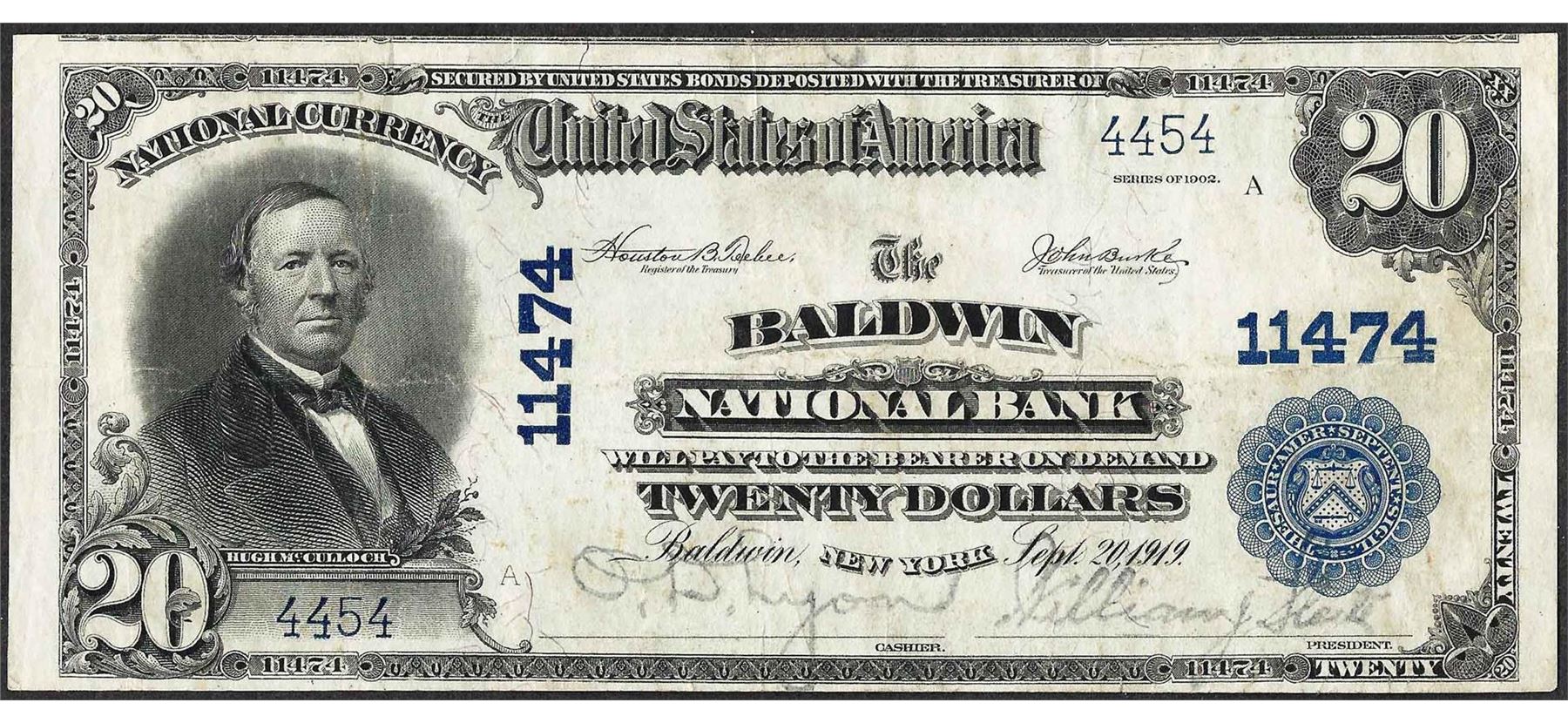 One 1902 PB $20 National Currency Note Baldwin, NY CH# 11474.