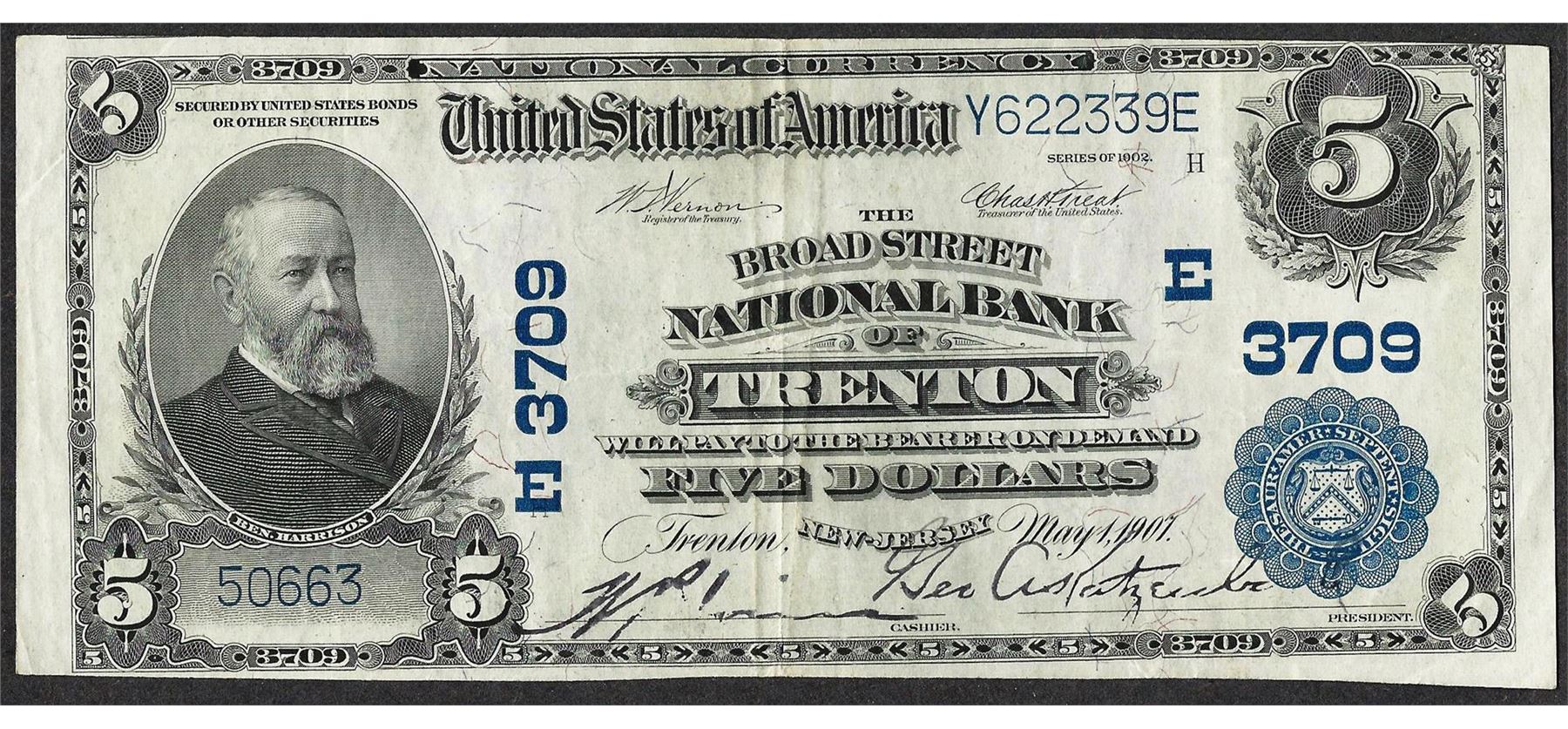 1902 PB $5 Broadstreet NB of Trenton, NJ CH# 3709 National Currency Note