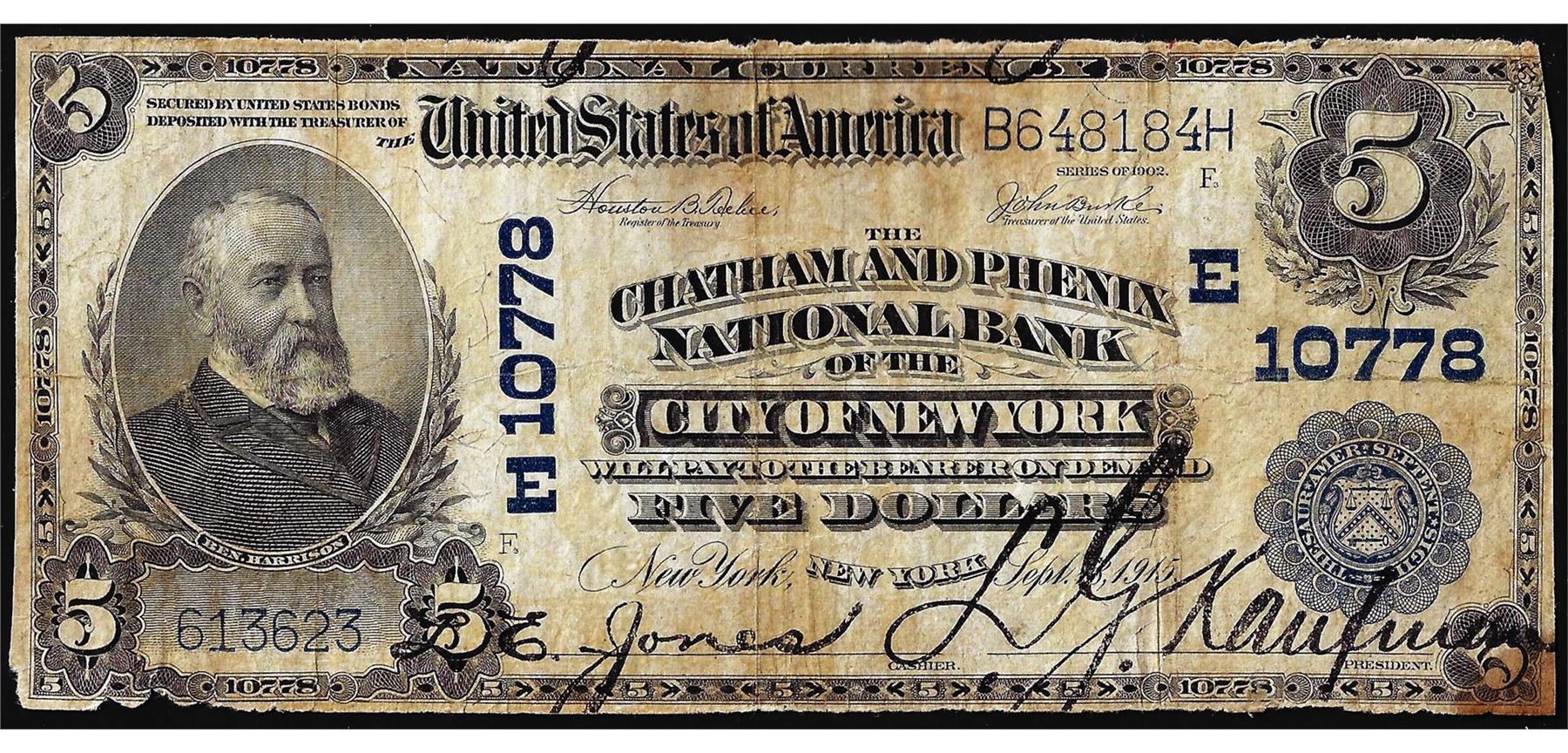 1902 PB $5 Chatham & Phenix NB of City of New York, NY CH# 10778 National Currency Note