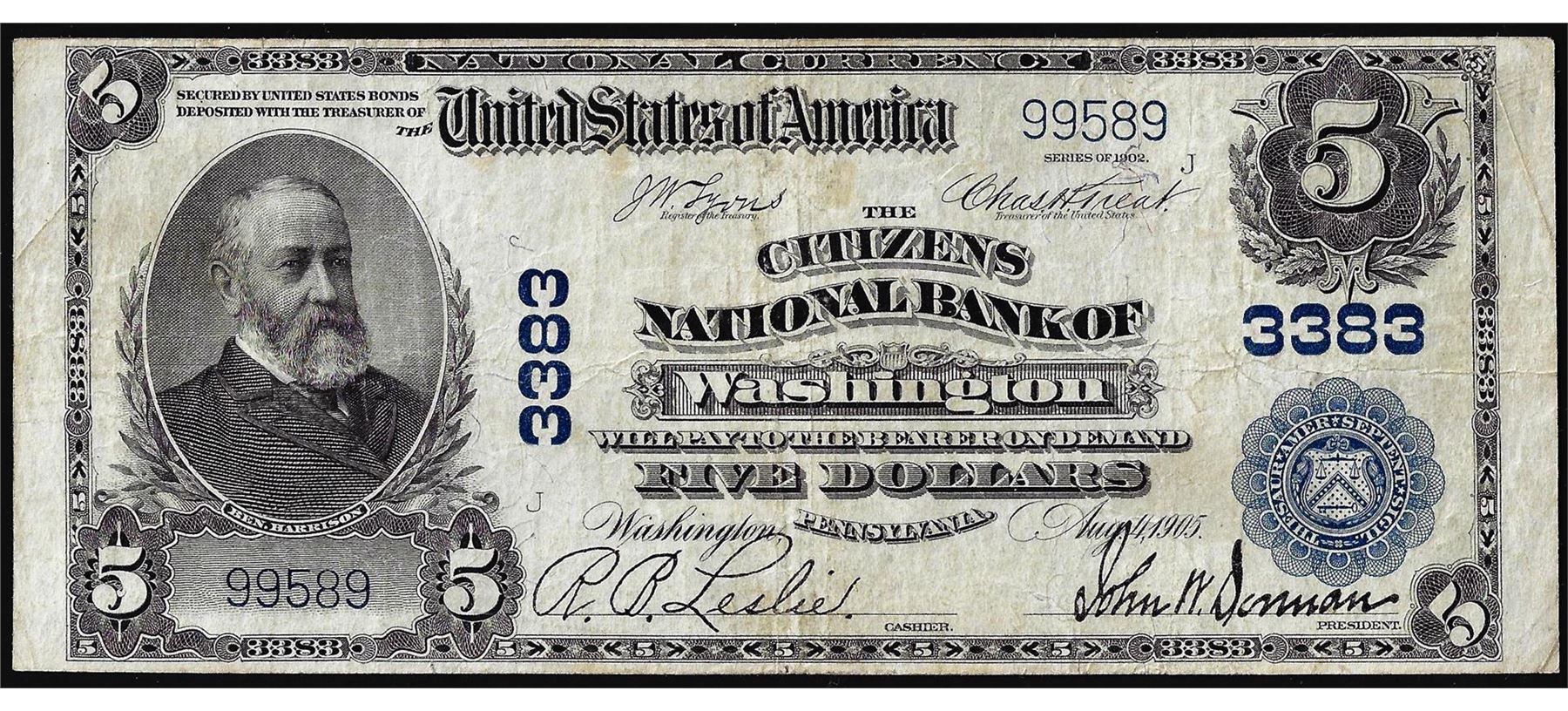 One 1902 PB $5 Citizens NB of Washington, Pennsylvania CH# 3383 National Currency Note.