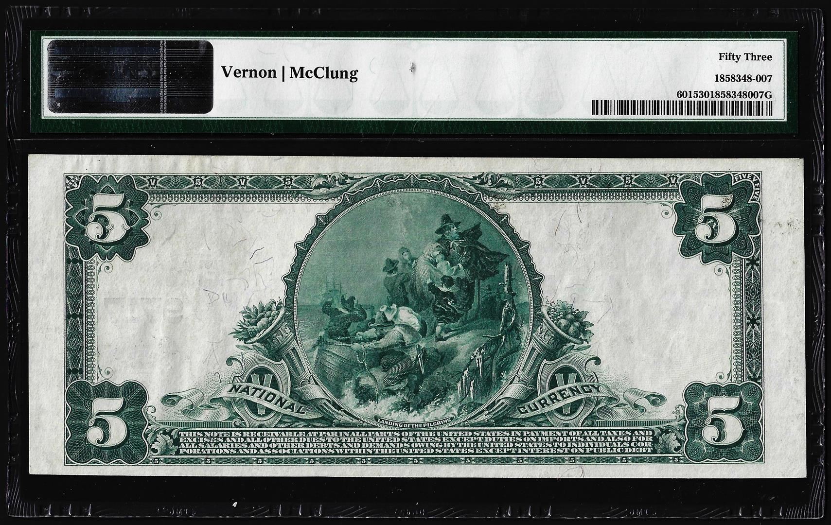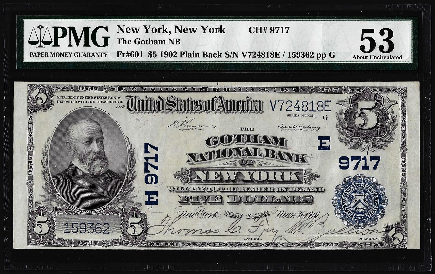 One 1902 PB $5 Gotham NB New York, NY CH# 9717 National Note PMG About Uncirculated 53. PMG Certified.