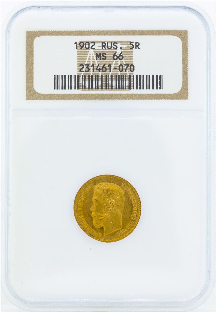 One 1902 Russia 5 Roubles Gold Coin NGC MS66. NGC Certified.