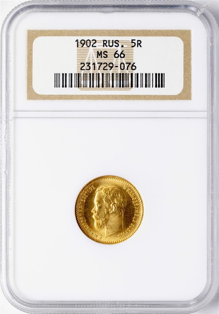 One 1902 Russia 5 Roubles Gold Coin NGC MS66. NGC Certified.