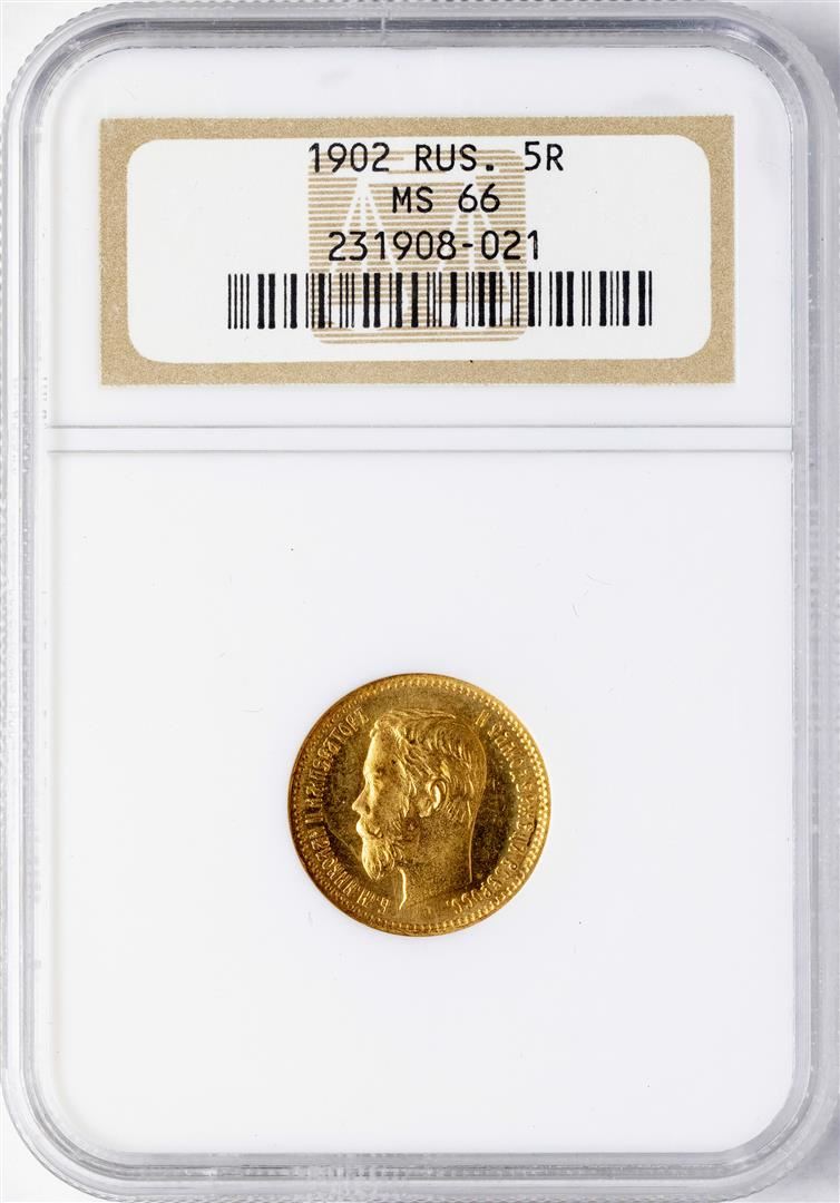 One 1902 Russia 5 Roubles Gold Coin NGC MS66. NGC Certified.