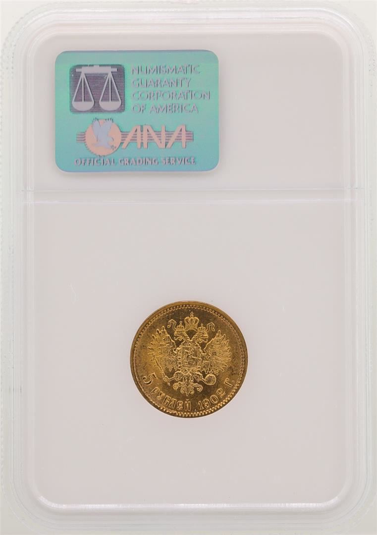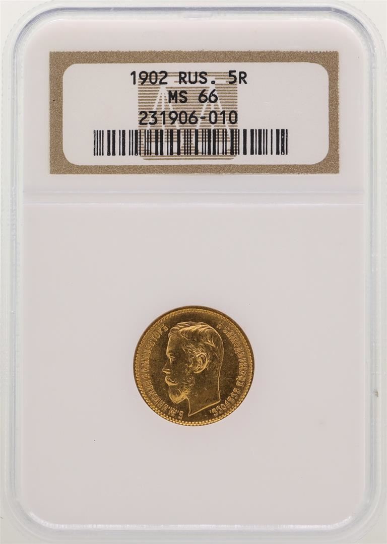 One 1902 Russia 5 Rubles Gold Coin NGC MS66. NGC Certified.