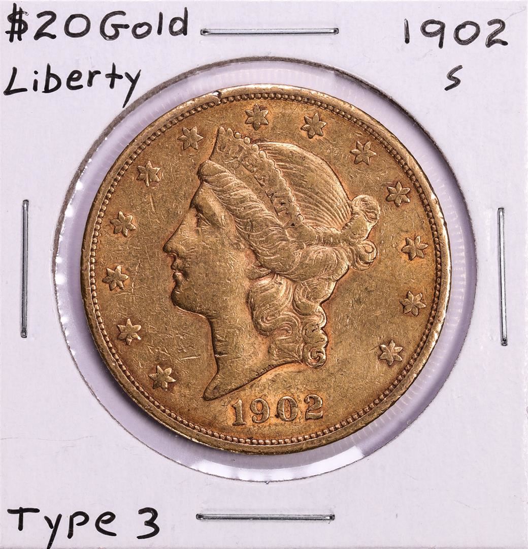 One 1902-S $20 Liberty Head Double Eagle Gold Coin .