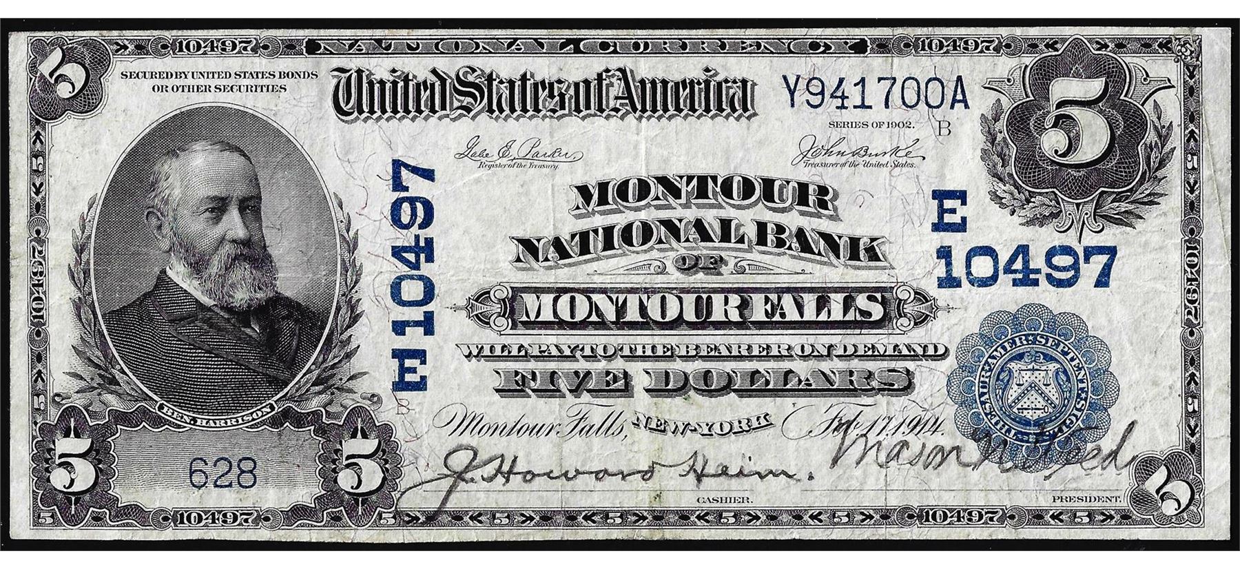 One 1902DB $5 Montour NB of Montour Falls, New York CH# 10497 National Currency Note.