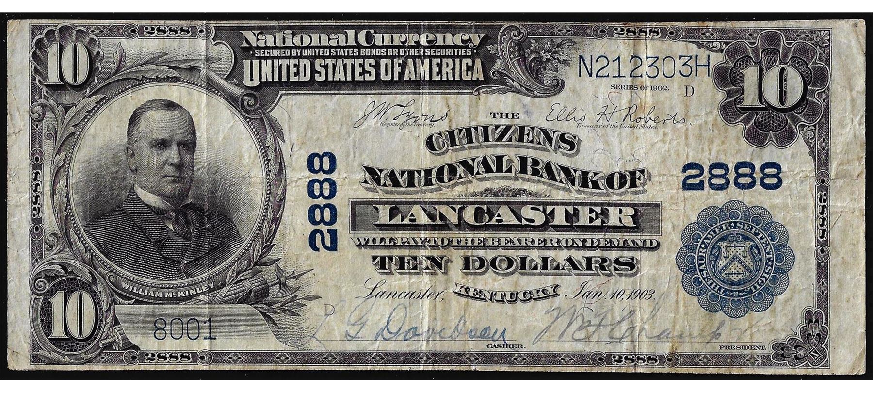 One 1902PB $10 Citizens National Bank of Lancaster, KY CH# 2888 National Currency Note.