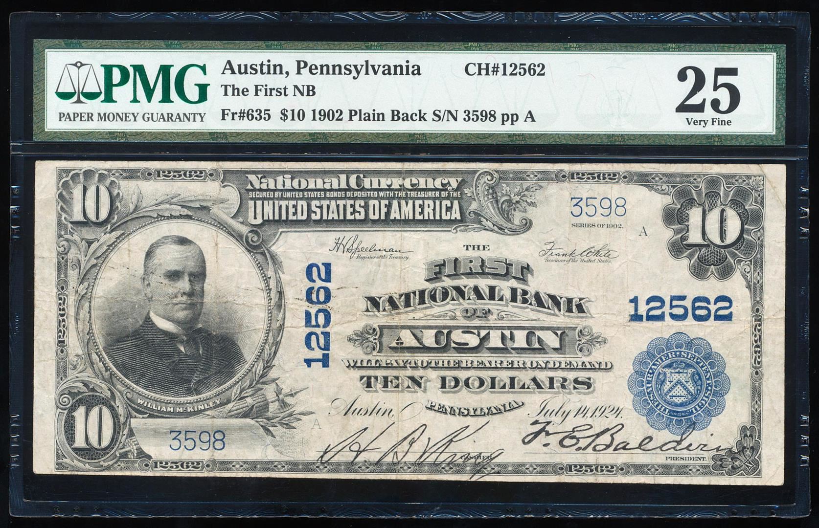 One 1902PB $10 First NB of Austin, PA CH# 12562 National Bank Note PMG Very Fine 25. PMG Certified.