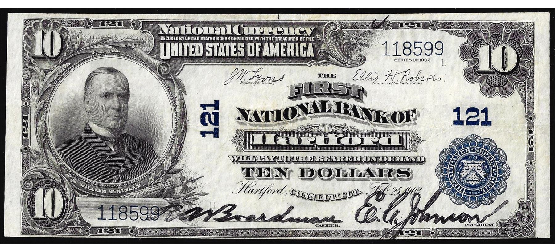 One 1902PB $10 First National Bank of Hartford, CT CH# 121 National Currency Note.