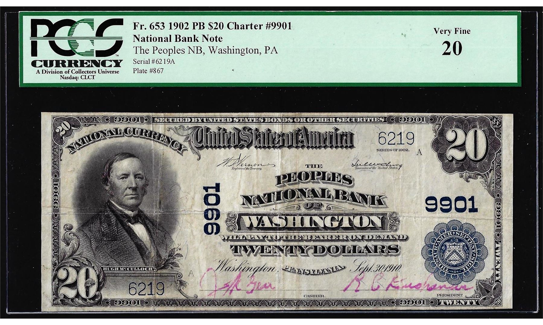 1902PB $20 Peoples NB of Washington, PA CH# 9901 National Currency Note PCGS VF20