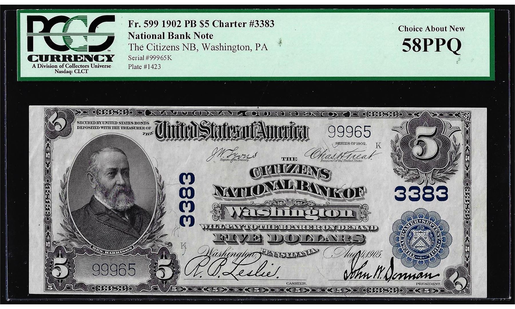 One 1902PB $5 Citizens NB of Washington, PA CH# 3383 National Currency Note PCGS AU58PPQ. PCGS Graded.
