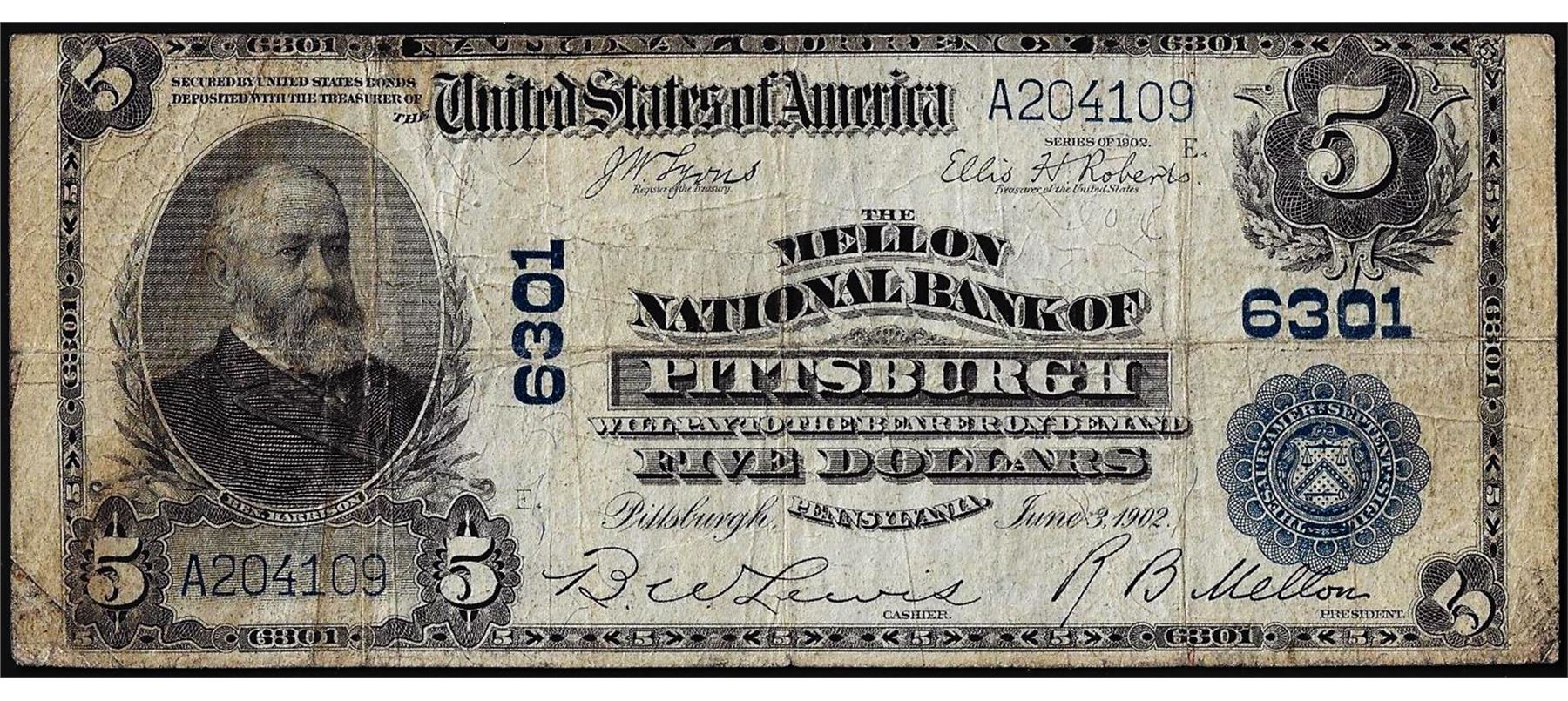 One 1902PB $5 Pittsburgh, PA CH# 6301 National Currency Note.