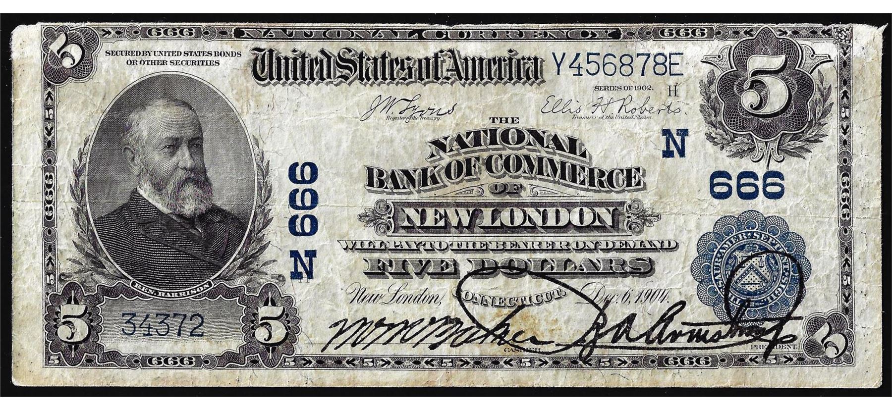One 1902PB $5 The National Bank of Commerce New London, CT CH# 666 National Currency Note.